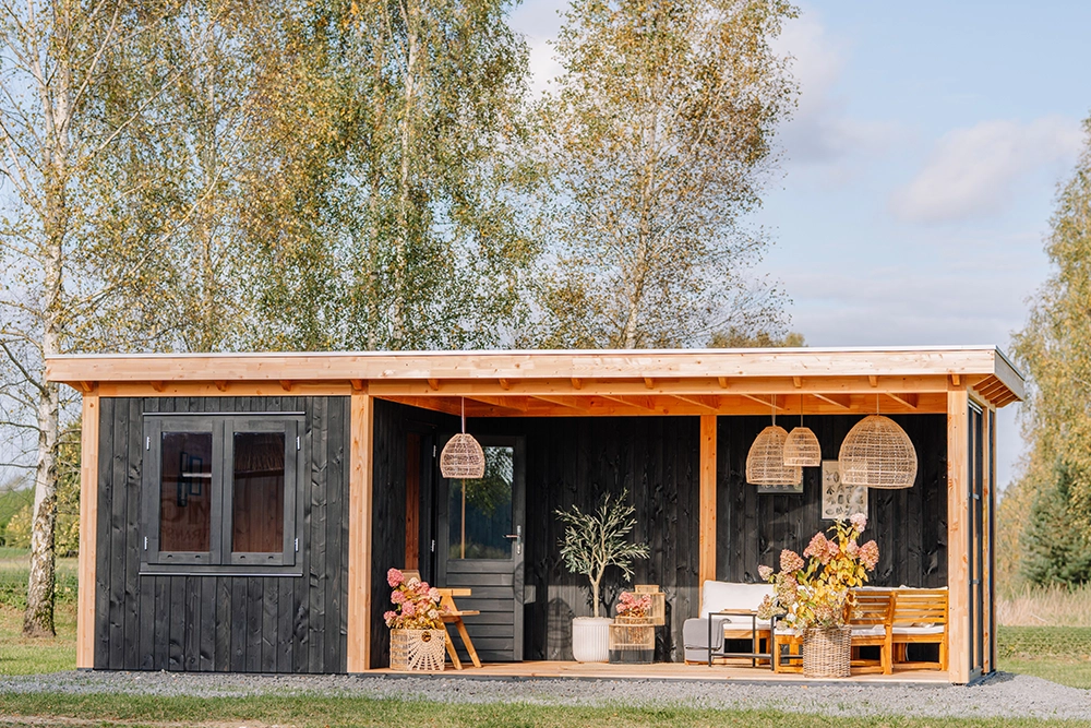 Une cabane en bois pleine de charme, mêlant authenticité et touches bohèmes : mobilier en rotin, tissus naturels et lumières douces. Elle invite à la détente et à la déconnexion dans un cadre à la fois élégant et chaleureux.
